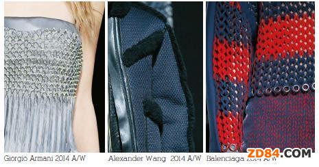 當(dāng)然有的設(shè)計(jì)師只借用了網(wǎng)眼的造型,通過(guò)獨(dú)特的改造,形成了自家獨(dú)特的網(wǎng)眼面料。Giorgio Armani通過(guò)打褶的形式制造了一種特殊的網(wǎng)狀結(jié)構(gòu),并在灰色和綠色中找到了一種相容性,使服裝既有運(yùn)動(dòng)的感覺(jué),又不失高級(jí)與時(shí)尚。Balenciaga使用了一種特殊的復(fù)合物,編織出了類(lèi)似于大針孔針織面料的新型材料,創(chuàng)造出一種新型并實(shí)用的運(yùn)動(dòng)感服裝。