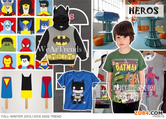 舒適的運動裝和日裝重新演繹,用街頭風格和超級英雄的主題包裝,將幻想和功能性結(jié)合,充滿活力的童裝用前衛(wèi)的手繪手法、跳躍色彩和俏皮細節(jié),將怪異風格與運動舒適性融合一起。醒目的色塊以經(jīng)典漫畫里英雄人物的色調(diào)為基礎(chǔ),簡化或形象化的改造,增添了耐人尋味的韻味。噴涂和涂鴉效果是街頭藝術(shù)的標志,搭配硬朗的金屬光澤將童裝融入更多的前衛(wèi)感。美式漫畫書里的對話泡泡以及流行字體打造的另類版面,加上明亮色彩的點綴更突顯出夸張藝術(shù)。同樣以英雄人物為主題的配件單品使得孩童街頭造型更加潮味十足。