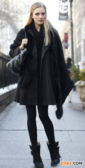 時(shí)尚解析:黑色皮草外套搭配長(zhǎng)款裙,展現(xiàn)出甜美、小鳥依人的一面。