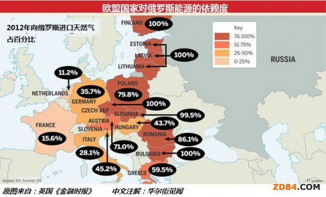 英國《金融時報》根據(jù)國際能源署(IEA)、歐洲統(tǒng)計局和美國能源情報署(EIA)的數(shù)據(jù)制作了以下圖表。它展示了部分歐盟國家對俄羅斯進口能源的依賴度。