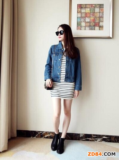 短款的牛仔外套搭配條紋的連衣裙,大走休閑時尚的路線,腳上的黑色短靴帥氣十足,黑色鏈條包增添造型亮點,更加吸睛。