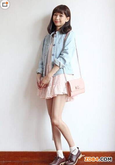 洗白的牛仔外套很有復(fù)古的感覺,內(nèi)搭的粉色蕾絲連衣裙甜美又可愛,棕色皮鞋和白色棉襪更是小女生最愛的日系造型。